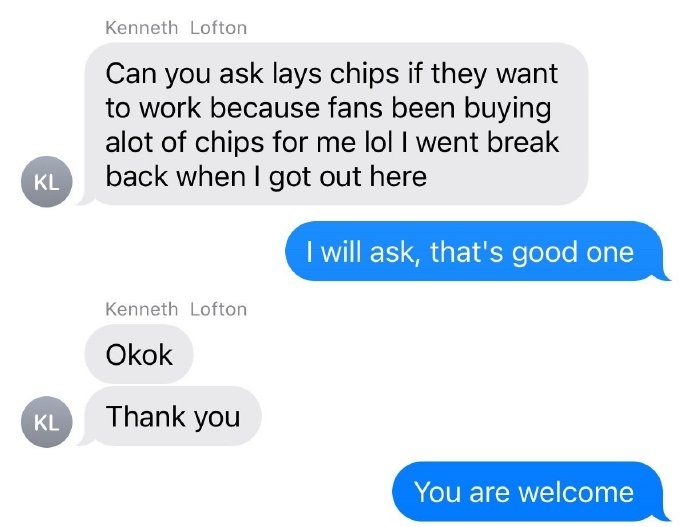 鲍仁君晒出洛夫顿的聊天记录,小胖表示:“能不能帮忙找乐事薯片,问问他们需不需要合作?因为我一到这里粉丝们就不停给我买薯片,哈哈,我都招架不住了。”