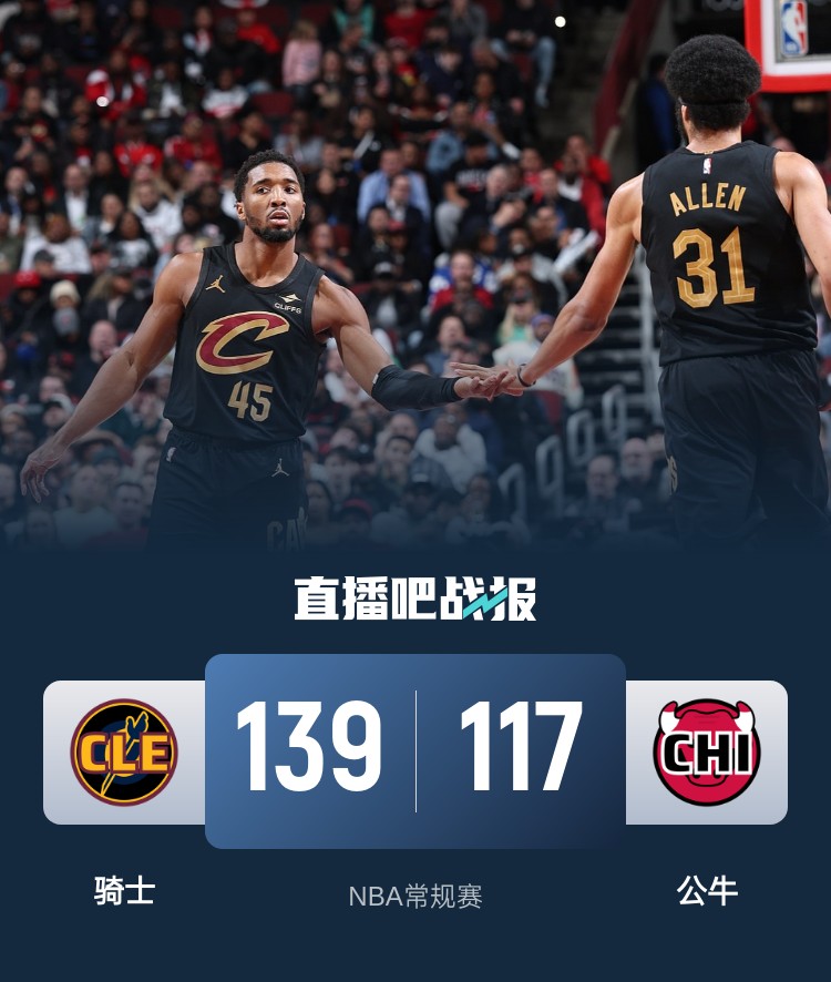米切尔28+7 阿伦25+17 怀特25+7 骑士逆转大胜公牛豪取11连胜