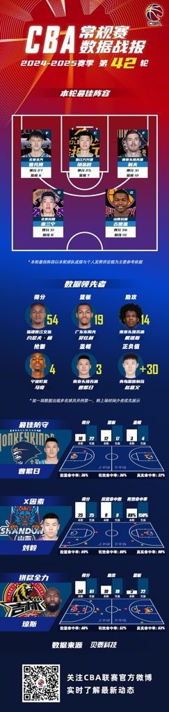 2024-2025赛季CBA联赛常规赛第42轮结束较量,来自北京首钢篮球俱乐部的曾凡博 ,浙江广厦篮球俱乐部的胡金秋,南京同曦篮球俱乐部的利夫,北京控股篮球俱乐部的廖三宁和山西汾酒职业篮球俱乐部的古德温入选CBA联赛常规赛第42轮最佳阵容!