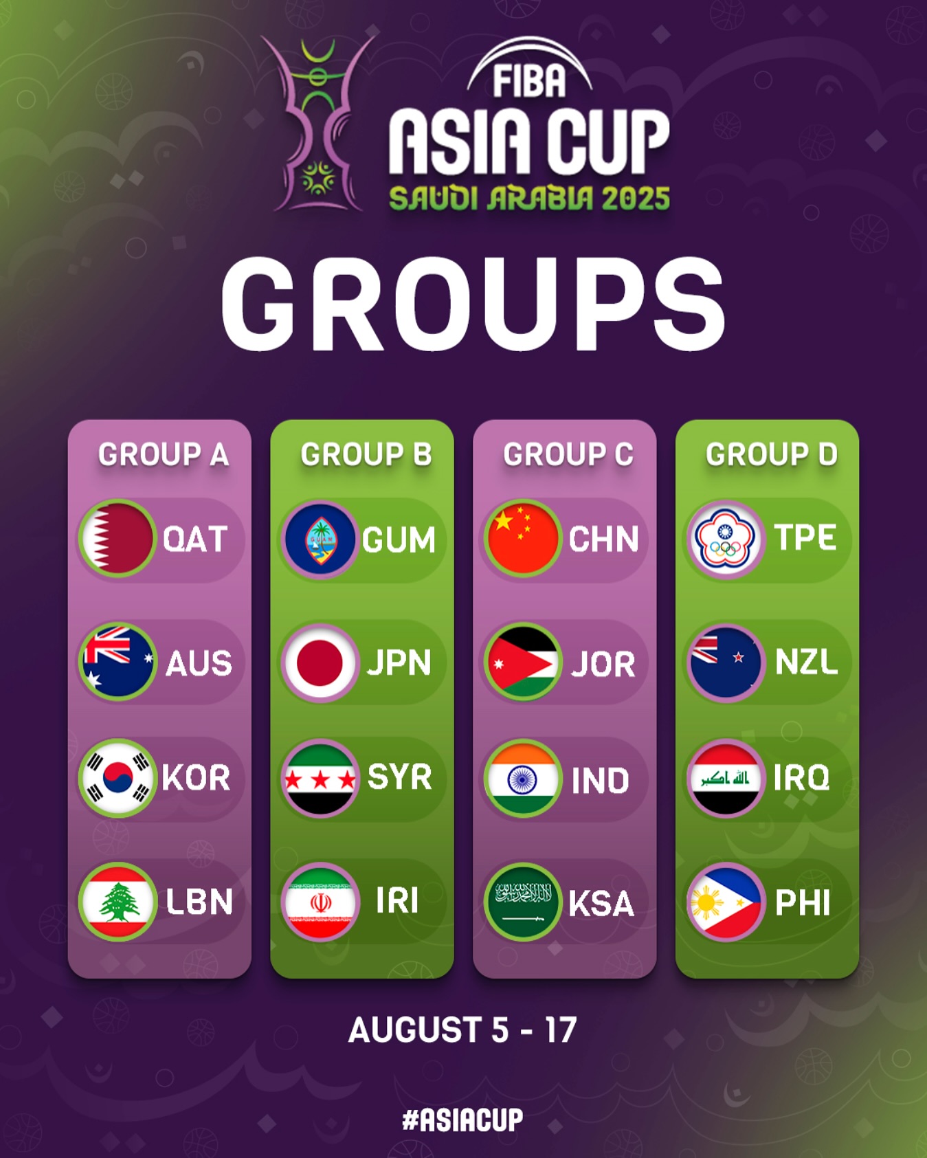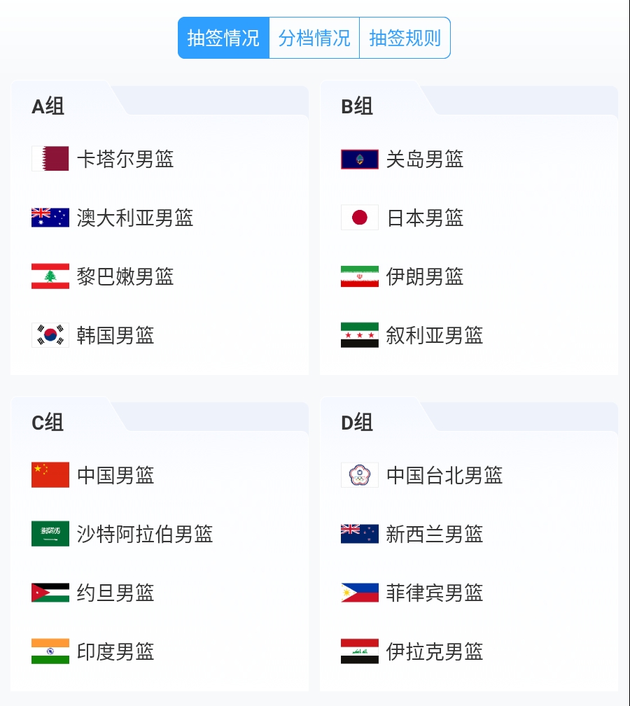 2025男篮亚洲杯分组出炉:中国男篮和沙特/约旦/印度同组