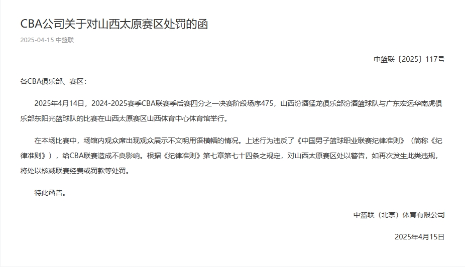 在本场比赛中,场馆内观众席出现观众展示不文明用语横幅的情况。上述行为违反了《中国男子篮球职业联赛纪律准则》(简称《纪律准则》),给CBA联赛造成不良影响。根据《纪律准则》第七章第七十四条之规定,对山西太原赛区处以警告,如再次发生此类违规,将处以核减联赛经费或罚款等处罚。