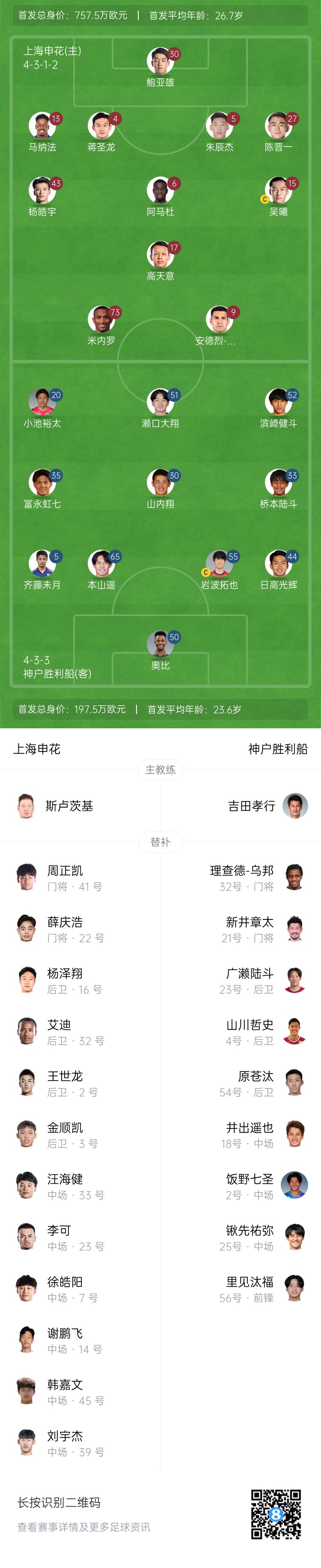 2月18日讯 北京时间今晚20点,亚冠精英联赛东亚区第8轮,上海申花主场迎战神户胜利船,赛前两队公布首发阵容。
