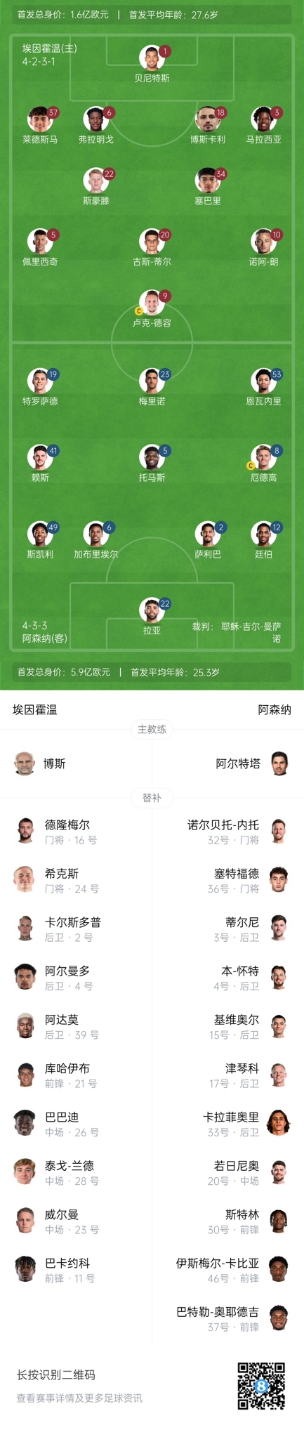 3月5日讯 欧冠1/8决赛首回合,埃因霍温主场迎战阿森纳,赛前首发名单公布。