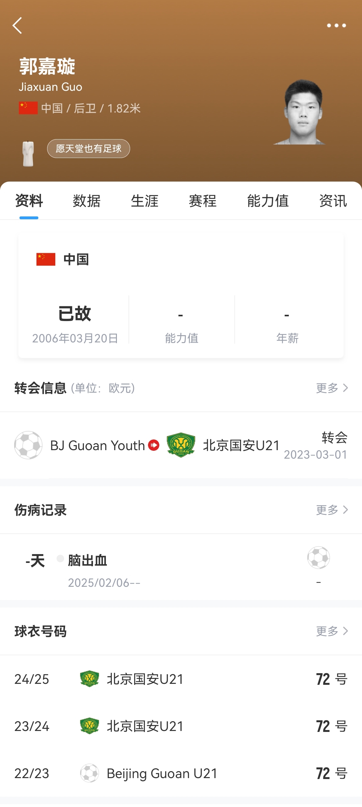 3月19日,国安小将郭嘉璇在天坛医院去世,年仅18岁,当时距离他19岁的生日只有1个小时。