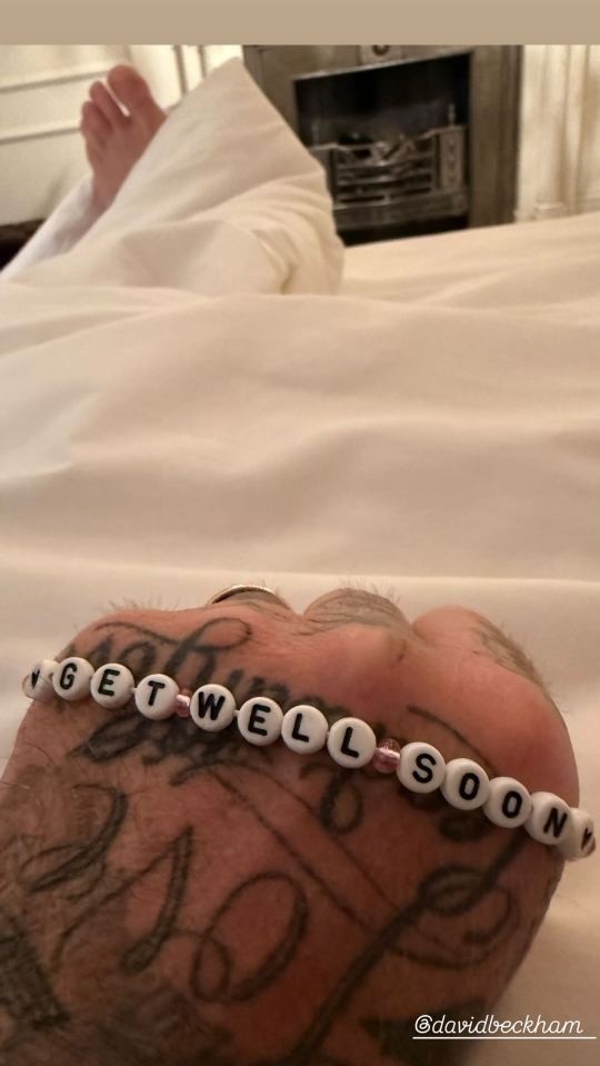 贝克汉姆51岁的妻子维多利亚今早在Instagram上向丈夫发了一条温馨的祝福:“早日康复,爸爸”。这位“黄金右脚”在术后被拍到面带微笑,手臂戴着蓝色吊带。另一张照片显示,贝克汉姆还戴着一个可爱的腕带,上面写着:“早日康复”。